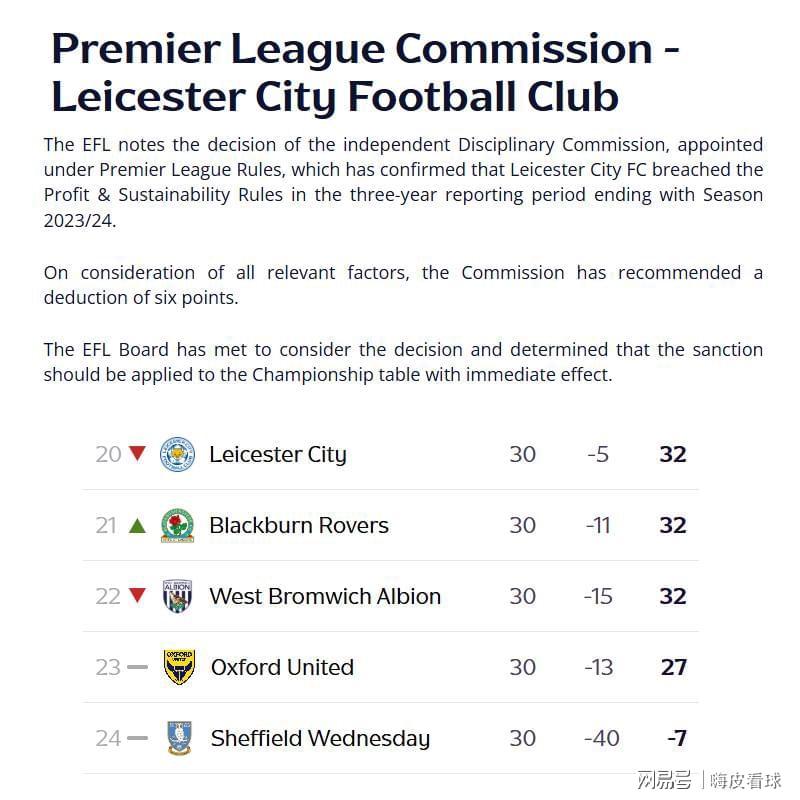 英格兰足球联赛(EFL)刚刚发布消息,表示注意到独立纪律委员会的决定,这是根据英超联赛规则而任命的,确认了莱斯特城因为在过去三个赛季里,违反了盈利和可持续(PSR)的规则。因此,立刻扣除莱斯特城6个积分,并且从实时的积分榜中反映出来。