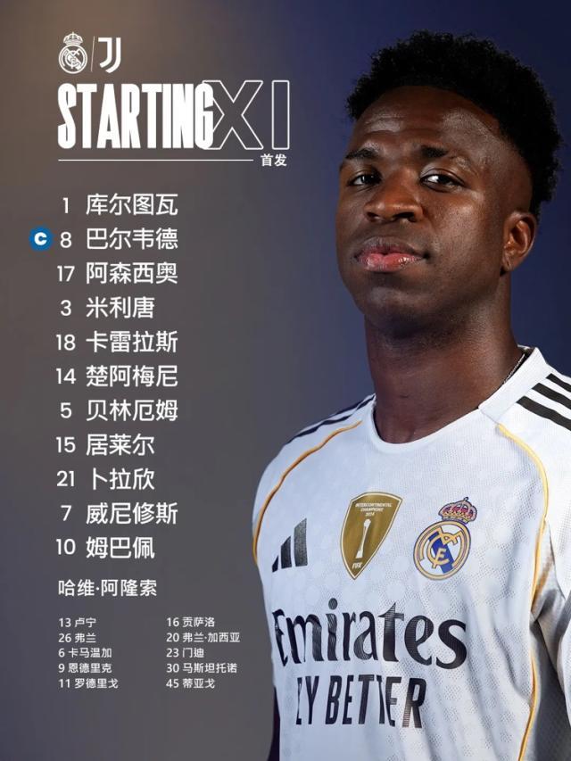 欧冠联赛阶段第三轮打响,皇马在伯纳乌球场迎战尤文图斯。最终凭借贝林厄姆的补射进球,皇马1-0击败尤文图斯拿到三分。 比赛首发 第74分钟,卡马温加替补换下居莱尔 第84分钟,马斯坦托诺、弗兰·加西亚替补换下维尼修斯、卜拉欣·迪亚斯 第88分钟,贡萨洛·加西亚替补换下劳尔·阿森西奥 第61分钟,图拉姆被换下,孔塞桑替补登场。 第74分钟,弗...